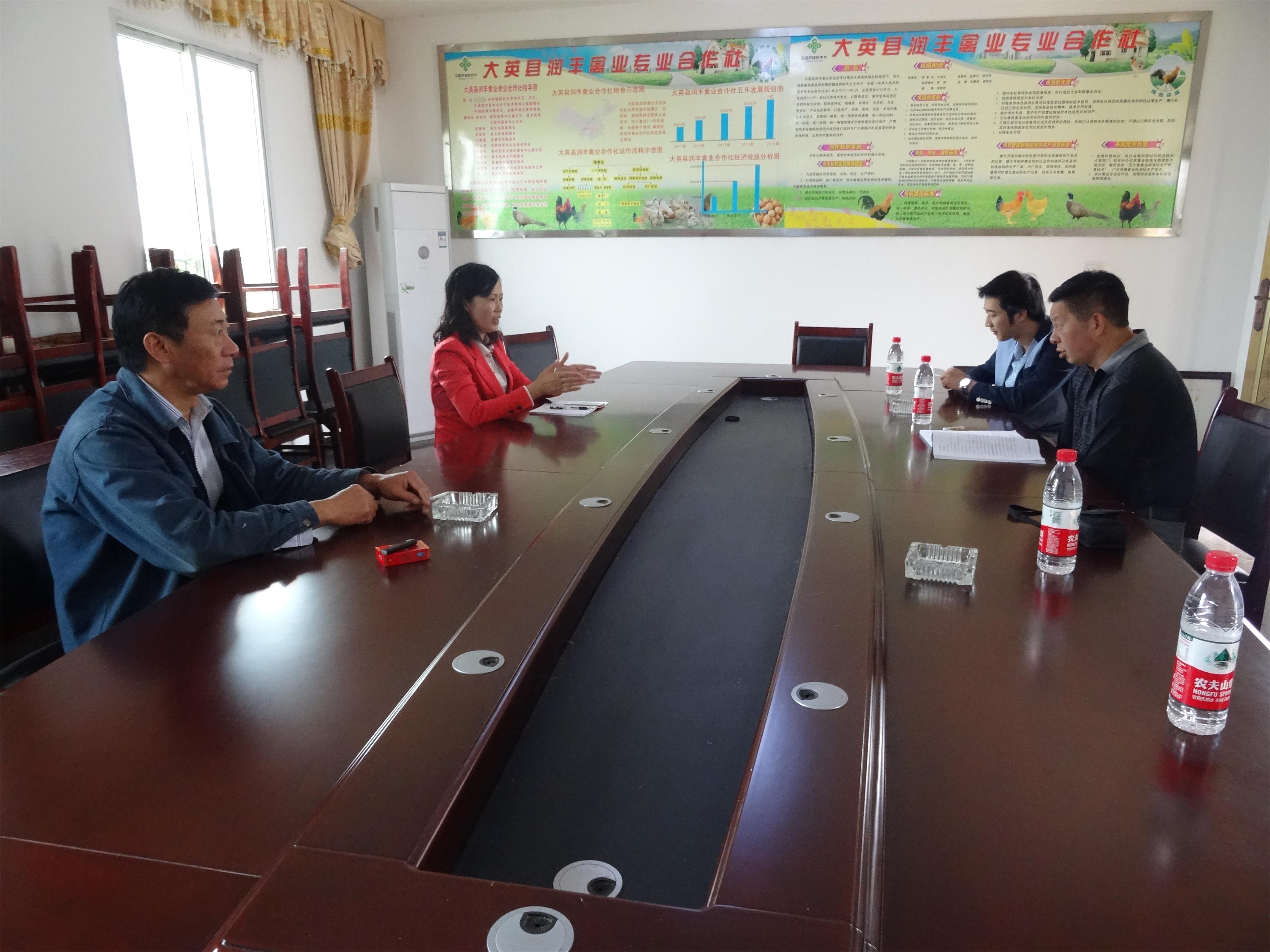 10月20日上午,大英县供销社副主任吴会权(右一)率县供销社业务股副股长、农民专业合作经济组织服务中心副主任刘汶博(右二)深入到隆盛镇润丰禽业专业合作社调研、指导专业合作社发展。