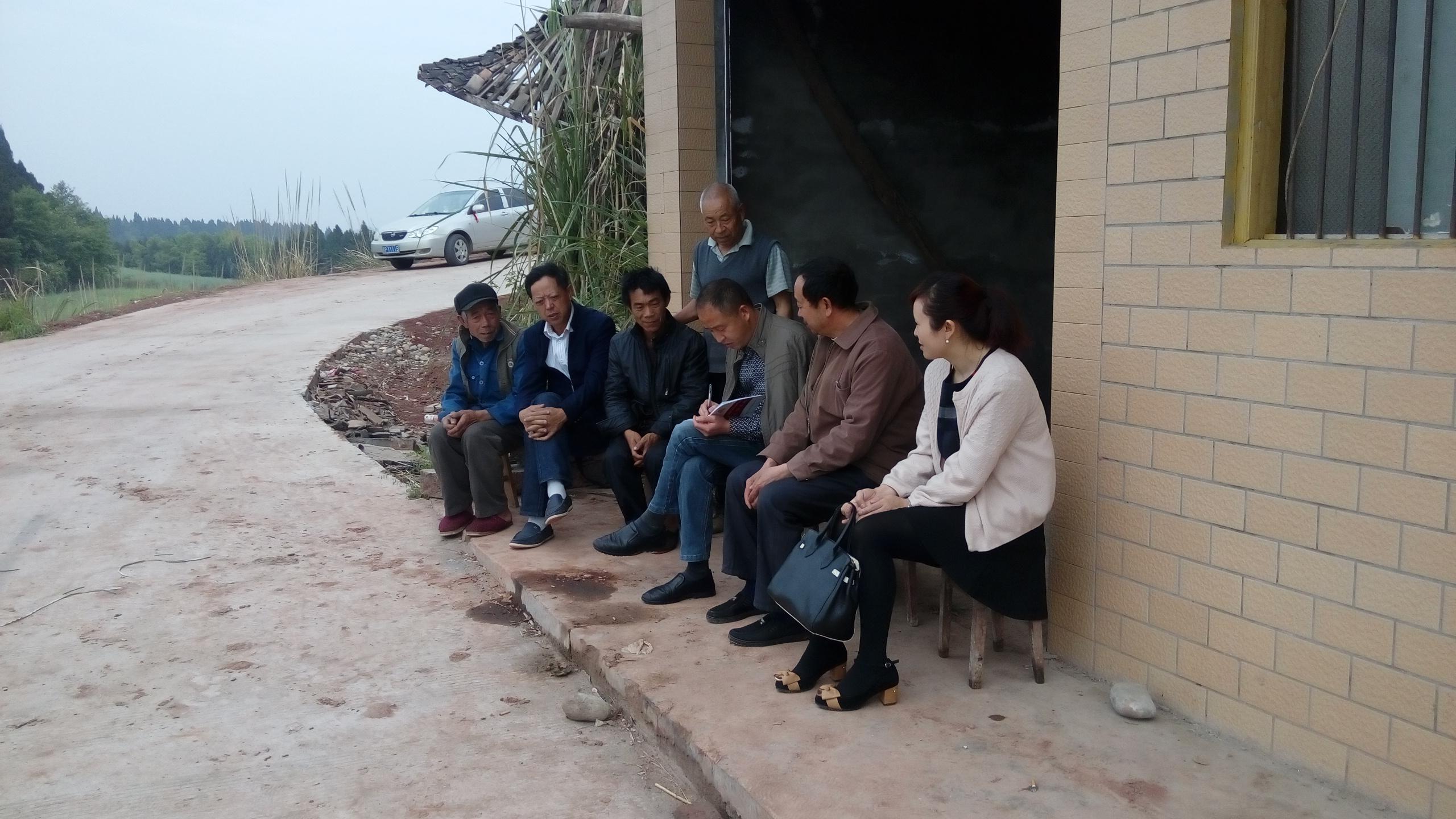 4月7日,大英县正果农业开发有限公司董事长邓辉荣(左二)在天保镇副镇长、驻村作组长梁剑(右三)、驻村第一书记何俊阳、副书记陈艳(右一)等村、社干部的陪同下到扶贫村了解村情民意,为今后发展壮大农民专业合作社奠定基础。