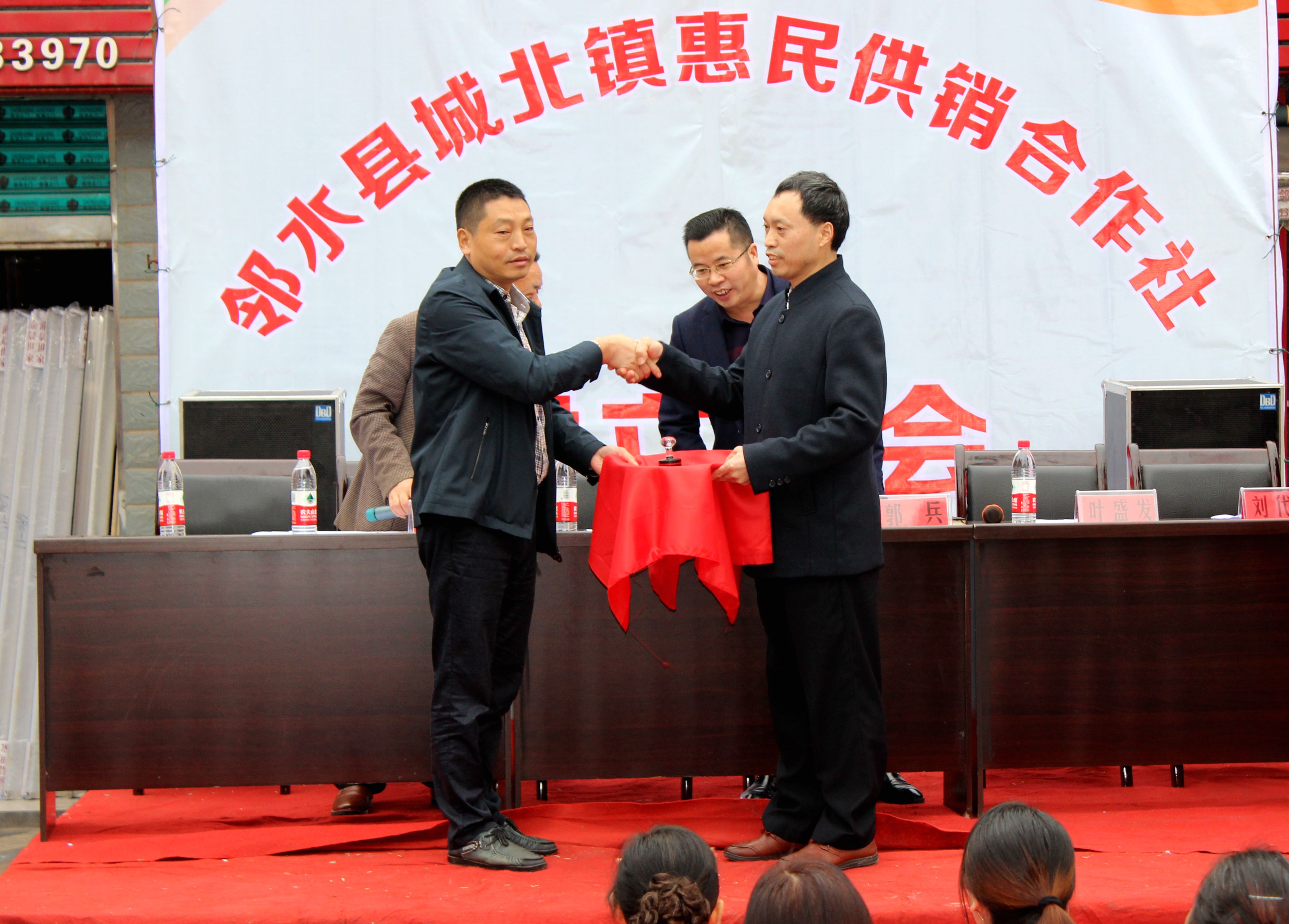 11月16日上午,秋高气爽,在邻水城北镇赵家桥社区办事处门前的成立大会上,随着城北镇党委副书记、镇长郭兵宣布:邻水县城北镇惠民供销合作社正式挂牌成立了。接着,城北镇党委副书记、镇长郭兵,县供销社党委书记、主任文科在100多名参会社员以及备界人士的热烈掌声中向城北镇惠民供销合作社授牌、授章。