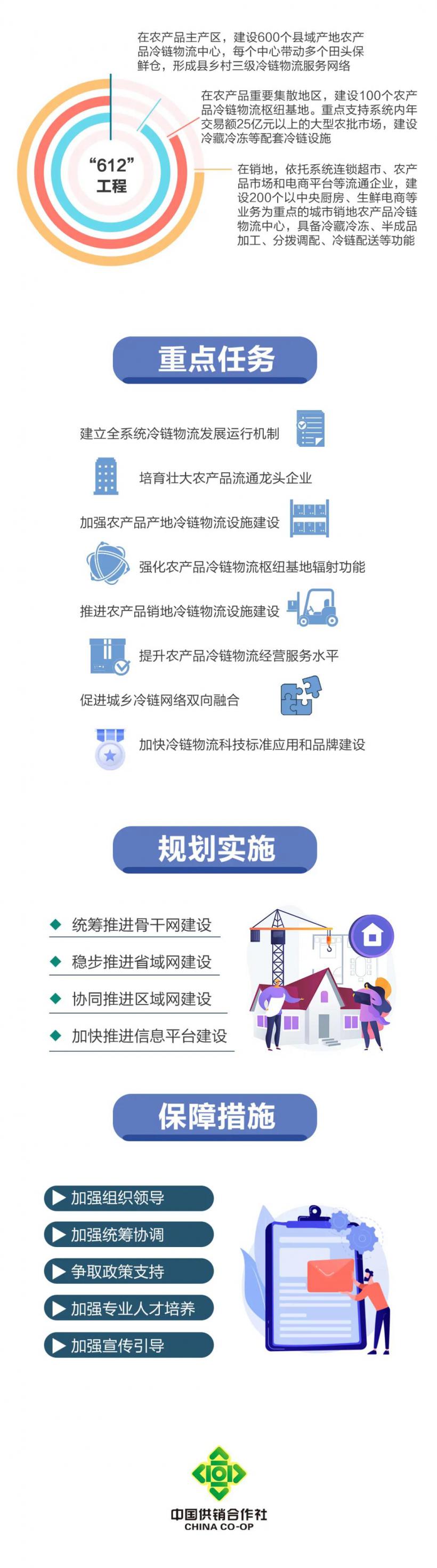 《规划》内容包含六个部分,从构建全国供销合作社农产品冷链物流骨干网、供销合作社农产品冷链物流省域网、供销合作社农产品冷链物流区域网与全国供销合作社农产品冷链物流公共服务信息平台进行总体布局,并设立了供销合作社系统公共型农产品冷链物流建设工程(“612”工程)、供销合作社农产品冷链物流先行省省域网建设工程两个专栏。提出了建立全系统冷链物流发展运行机制、培育壮大农产品流通龙头企业、加强农产品产地冷链物流设施建设、强化农产品冷链物流枢纽基地辐射功能、推进农产品销地冷链物流设施建设、提升农产品冷链物流经营服务水平、促进城乡冷链网络双向融合、加快冷链物流科技标准应用和品牌建设等8项重点任务。