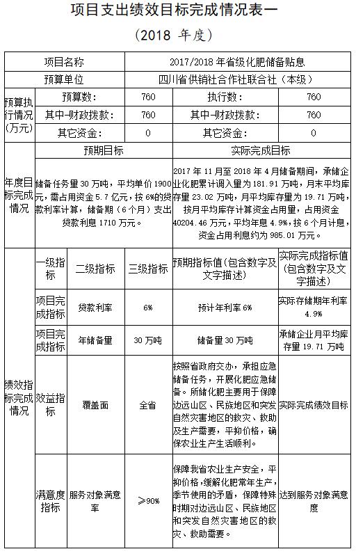1.省级化肥储备贴息项目绩效目标完成情况综述。项目全年预算数760.00万元,执行数为760.00万元,完成预算的100%。通过项目实施,保障我省农业生产安全,平抑价格,缓解化肥常年生产,季节使用的矛盾,保障特殊时期对边远山区、民族地区和突发自然灾害地区的救灾、救助需要。2017年11月至2018年4月储备期间,承储企业化肥累计调入量为181.91万吨,月末平均库存量23.02万吨,月平均库存量为19.71万吨,按月平均库存计算资金占用量,占用资金40204.46万元,平均年息4.9%,按6个月计息,资金占用利息约为985.01万元,承储企业完成了年初设定的绩效目标任务。实际累计调入量和平均库存量指标均高于省供销社关于储备数量的绩效目标,资金利息也远高于年初预算。