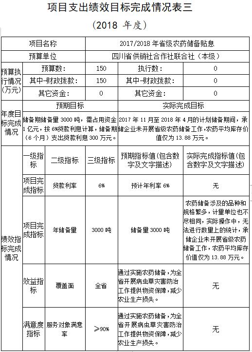 3.省级农药储备贴息项目绩效目标完成情况综述。项目全年预算数150.00万元,执行数为0万元,完成预算的0%。由于在2017年11月至2018年4月的计划储备期间,承储企业未开展省级农药储备工作,农药平均库存价值仅为13.88万元,未达到年初绩效目标,省社在第三季度绩效监控过程中就提出该储备贴息项目无法执行到位应作出调整的建议,年底仍未执行,财政予以收回。