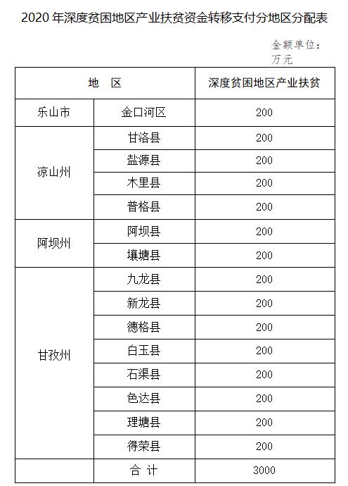 根据年初预算批复、以及报经斯丹副省长圈阅确定的2020年省级财政预算安排省级供销综合改革及发展专项资金(以下简称:综改资金)其中专项转移支付3000万元,用于支持供销脱贫攻坚产业扶贫项目。根据省脱贫攻坚领导小组办公室《深度贫困县脱贫攻坚专项2018年实施方案》(川脱贫办发〔2018]12号),为如期完成供销扶贫攻坚工作任务,安排第三批15个县(名单见附件1),每县200万元,计3000万元,用于支持深度贫困县建设供销合作社县级为农服务中心(含电商体验中心)和基层经营服务网络体系。