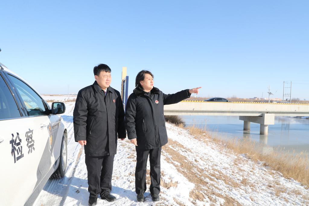 12月一场暴雪后,东营区检察院检察官再次来到武家大沟堤坝检查河道安全。(刘智峰 摄)