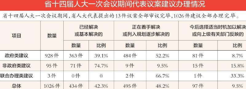 代表议案建议传递着人民的呼声、凝聚着人民的期盼。省人大常委会坚持以人民为中心,牢牢把握全过程人民民主的深刻内涵,创新工作机制,提升办理质量,把议案建议办理工作作为回应民生诉求、发挥代表作用、促进经济发展、聚民意惠民生的重要途径。省十四届人大一次会议期间,省人大代表提出的13件议案已全部审议完毕,1026件建议也全部办理完毕。议案建议“开花结果”,推动解决了一大批人大代表关注、人民群众关心的重点难点问题。