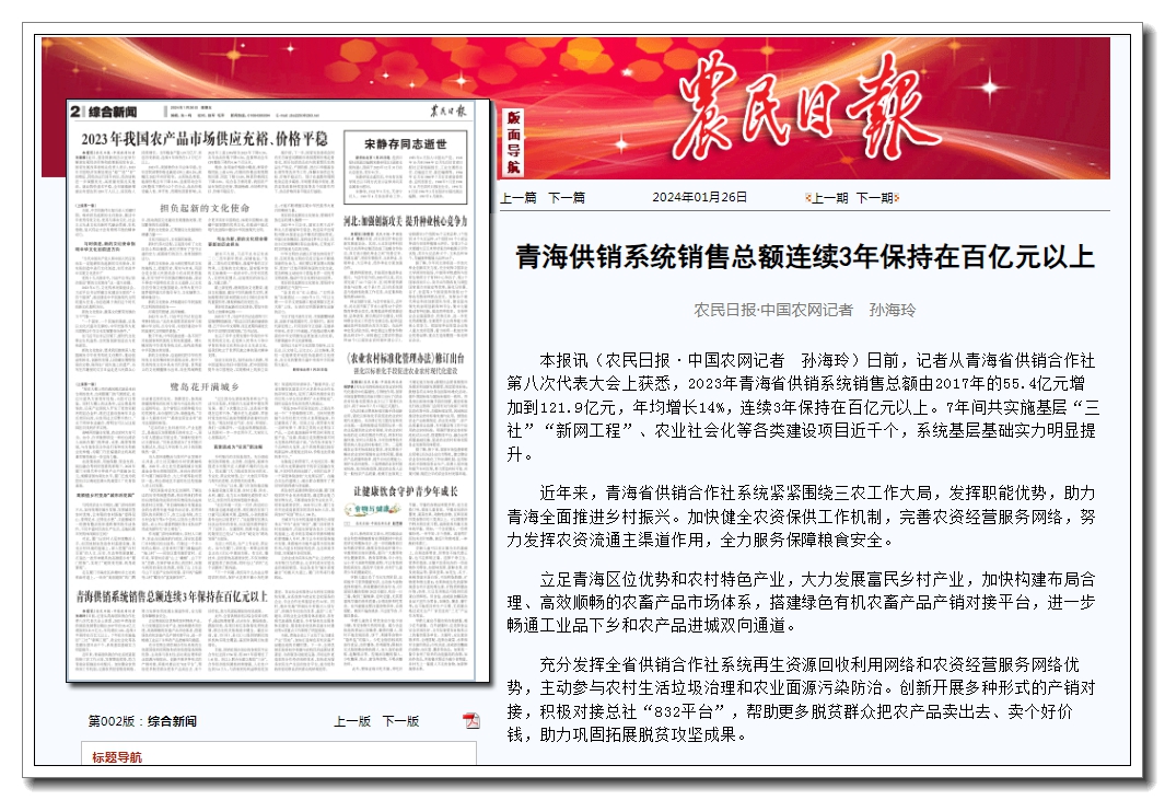 日前,记者从青海省供销合作社第八次代表大会上获悉,2023年青海省供销系统销售总额由2017年的55.4亿元增加到121.9亿元,年均增长14%,连续3年保持在百亿元以上。7年间共实施基层“三社”“新网工程”、农业社会化等各类建设项目近千个,系统基层基础实力明显提升。