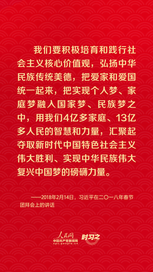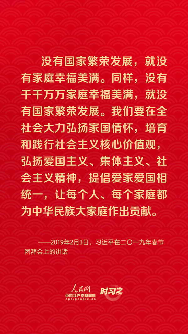 团圆是春节永恒的主题。“没有国家繁荣发展,就没有家庭幸福美满。同样,没有千千万万家庭幸福美满,就没有国家繁荣发展。”习近平总书记曾在多个场合深刻阐述家庭与国家之间的关系,从他的话语里一起感悟深厚的家国情怀。