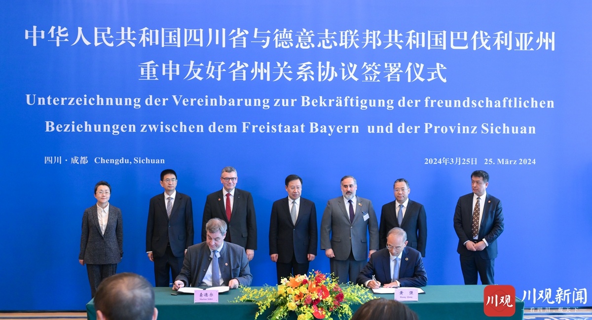 随后,黄强与索德尔分别代表双方签署《中华人民共和国四川省与德意志联邦共和国巴伐利亚州重申友好省州关系协议》。