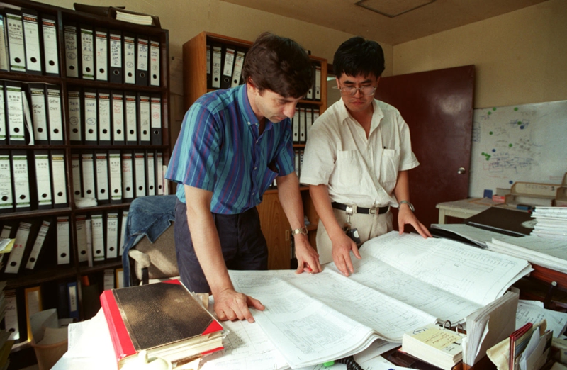 广东大亚湾核电站工程部的中法技术人员在研究安装工程进度(资料照片)。新华社记者 陈学思 摄