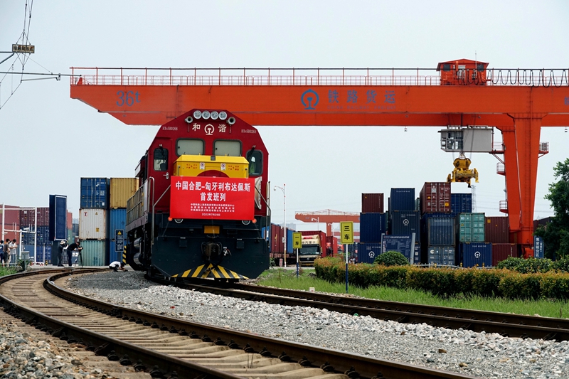 2022年7月29日,合肥至匈牙利布达佩斯的中欧班列从合肥北站物流基地驶出,标志着合肥中欧班列通往匈牙利布达佩斯的线路正式开通。新华社发(席静玉 摄)