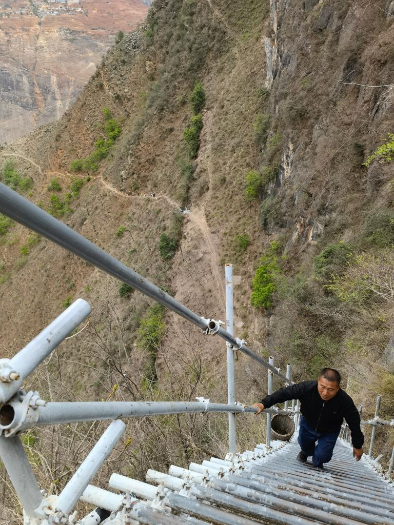 悬崖村钢梯上正在攀登的人。新华社记者 谢佼 摄