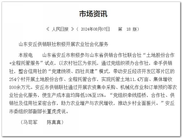 山东省安丘市积极参与山东省供销合作社联合社“土地股份合作+全程托管服务”试点,以农村社区为依托,通过党组织领办合作社,牵手供销社,整合信用社的“党建统领、四社共建”模式,带动安丘经济开发区等片区的254个村开展土地股份合作、全程托管合作,实现托管土地11.4万亩、集体增收800余万元。安丘市供销联社通过开展农资集中采购、机械化作业和订单预约等农业社会化服务,使生产成本亩均降低10%至15%。“党组织牵线搭桥,合作社、供销社及信用社紧密合作,助力农业增产与农民增收,推动乡村全面振兴。”安丘市委组织部副部长董虎虎说。