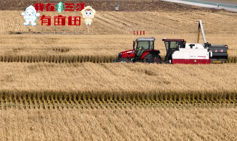 2024年10月13日,在北大荒集团黑龙江七星农场有限公司万亩水稻大地号中,无人驾驶收割机和无人驾驶接粮车在工作(无人机照片)。新华社发(党爱河 摄)