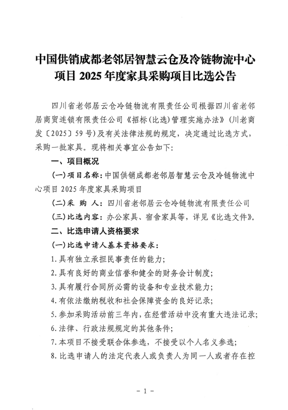 中国供销成都老邻居智慧云仓及冷链物流中心项目家具采购项目比选公告.pdf