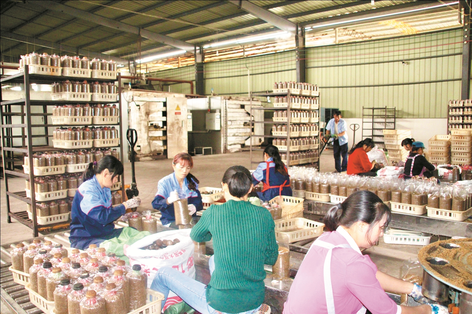 曲靖市供销合作社出资企业陆良爨乡绿圆菇业有限公司菌包生产车间员工正在制作菌包。受访单位供图
