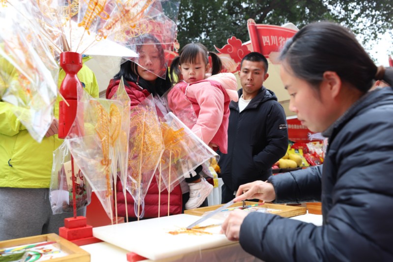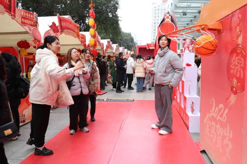 除了丰富的好物采购选择,现场丰富多彩的互动活动更让年味十足。“非遗寻年味”互动体验工坊内,书法家挥毫泼墨书写春联,糖画艺人巧手勾勒灵动造型,非遗传承人的现场创作引得市民纷纷驻足围观、拍照留念;“马年好运来”盲盒墙前人头攒动,市民参与趣味小游戏即可抽取特色试吃装、春联、文创礼品等惊喜福利;中央小舞台上,川剧变脸、民族歌舞轮番上演,穿插其间的有奖互动环节持续点燃现场气氛,欢声笑语不断。