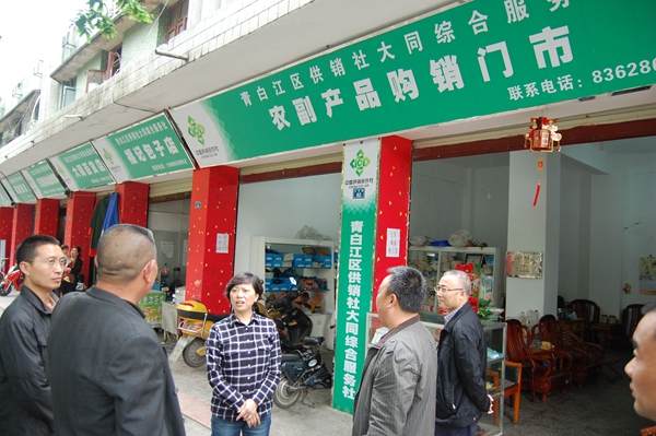 4 月13日 ,省供销社党组成员、副主任杨武秀率省社办公室、社务指导处负责人深入青白江区调研供销社基层组织建设工作。杨主任一行视察了大同综合服务社、大同农贸市场、兴景峰农业供销社有限公司,认真听取了区供销联社主任刘盛福的工作汇报,对供销社利用闲置资产发展社区综合服务社、兴办农贸市场,加快供销社基层组织建设等方面取得的成绩给予了充分肯定,要求供销社要认真贯彻落实中央11号文件精神,抓住机遇,在发展基层服务组织,拓展服务领域、增强服务职能、加快供销社转型升级等方面取得新成效,努力把供销社办成服务农民生产生活的生力军和综合平台。