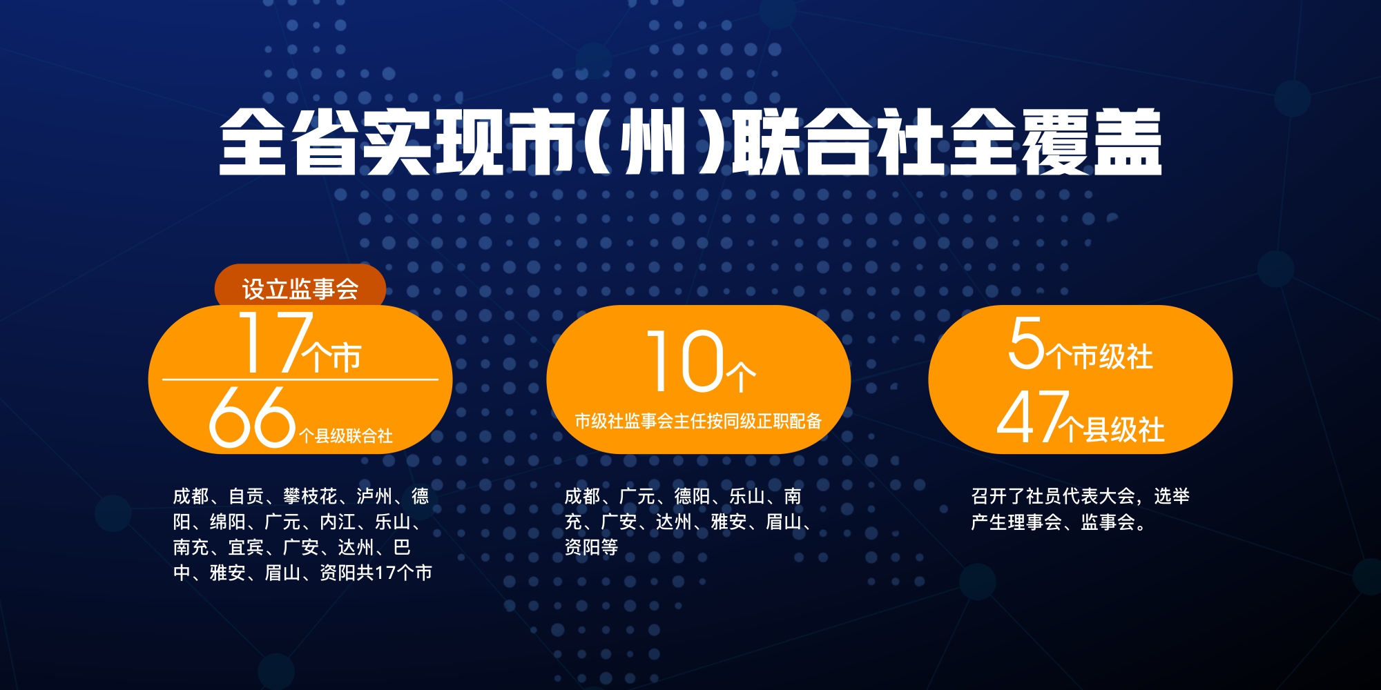 甘孜州农牧农村局挂牌了州供销社,峨眉山市新设立市供销社,广安市前锋区、广安区供销社从合署办公改为单设,凉山州11个无供销社机构的县明确了供销社工作职能部门,17个市、70个县级联合社设立监事会,成都、德阳、乐山、南充、广安、雅安、眉山、广元、资阳、达州10 个市级社监事会主任按同级正职配备。5个市级社、47个县级社恢复社员代表大会、理事会、监事会制度;