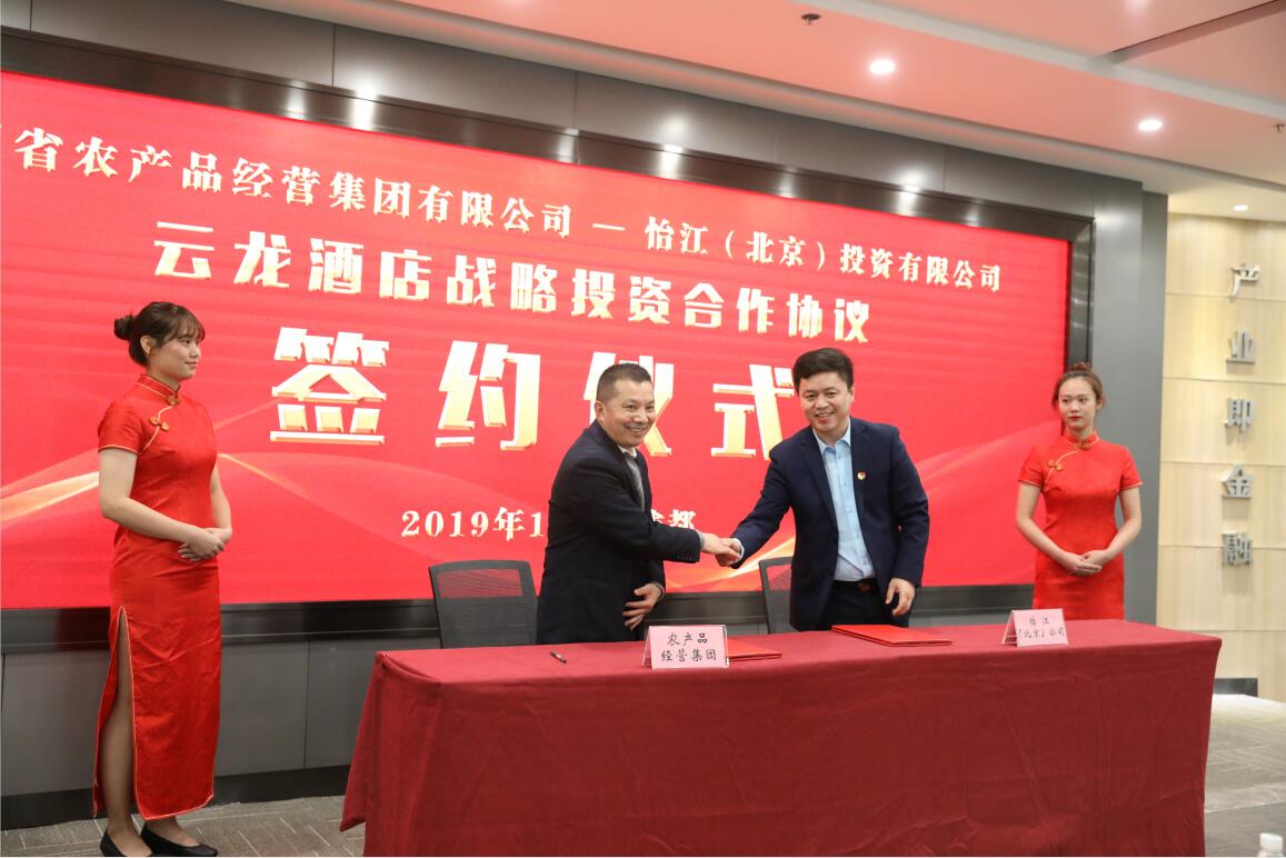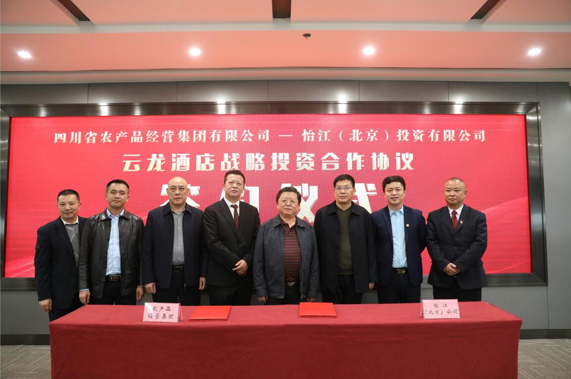 11月6日,四川省农产品经营集团与怡江(北京)投资有限公司就云龙酒店引入战略投资合作伙伴在成都市云龙大厦举行签约仪式。四川省供销社党组成员、副主任兼省供销投资集团董事长、总裁向伟益,四川省供销投资集团副总裁李志刚,怡江酒店集团CEO张华等出席签约仪式。签约仪式由四川省农产品经营集团董事长韦兴林主持。