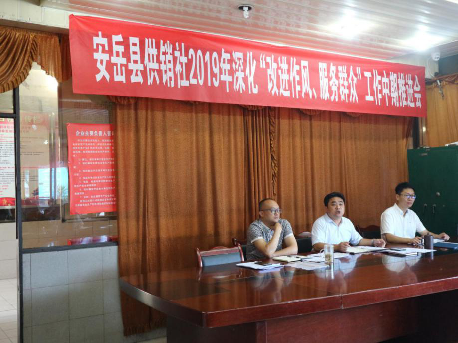 2019年8月7日上午,安岳县召开了安岳县供销社2019年深化“改进作风、服务群众”工作中期推进会,县供销联社机关全体干部职工、各中心供销社、县直公司和龙台资产管理组的法人代表、支部书记及工会主席共计40余人参加会议,会议由县联社党委委员、副主任李平同志主持。