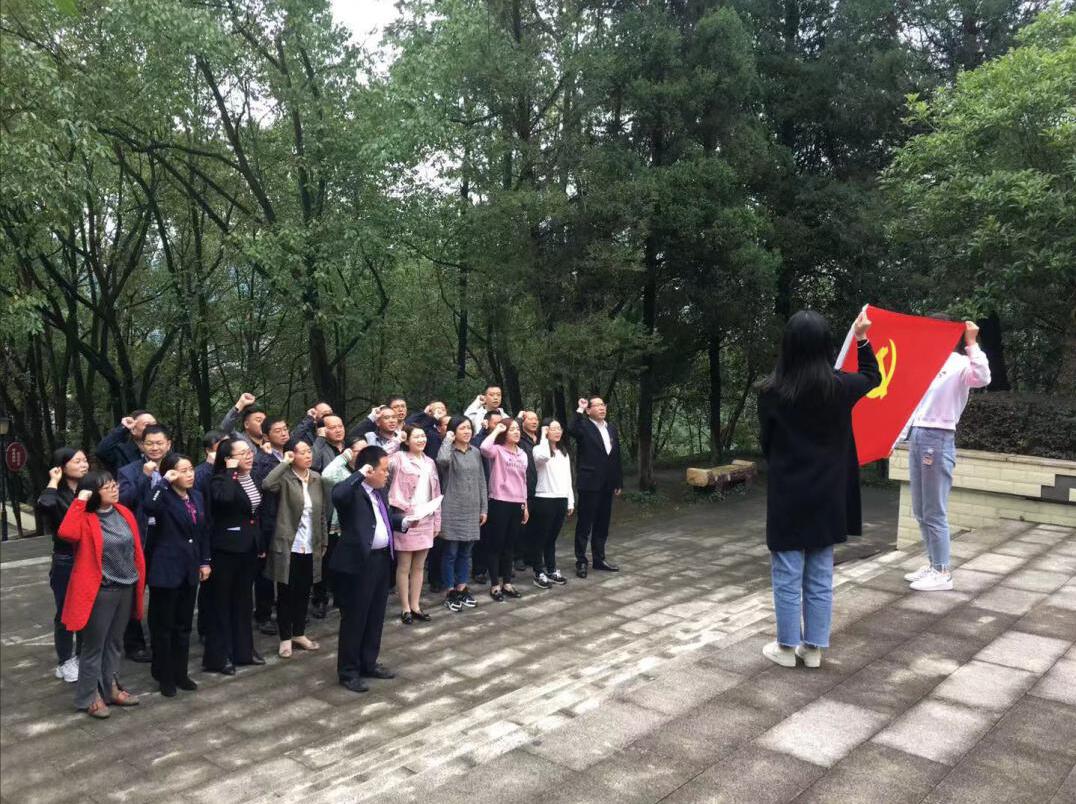 在烈士纪念碑前,全体党员干部怀着无比崇敬的心情向革命英烈敬献鲜花,致敬;面对庄严的党旗,庄重地举起右拳,重温入党誓词。每位党员干部怀着对党的感激、自豪之情一起合唱《没有共产党就没有新中国》。