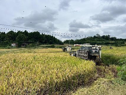 同时基地密切关注水稻的田间情况,根据作物状态及天气情况确定了最佳的收割时间,提前进行了田间排水和土地准备工作,为水稻提供了理想的收割条件。9月22日,仁寿基地正式启动水稻的抢收工作,多台收割机同时作业,收割、脱粒,一气呵成,一幅热火朝天的景象呈现在眼前。