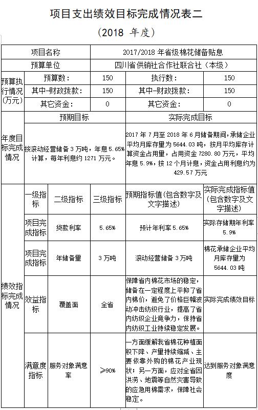 2.省级棉花储备贴息项目绩效目标完成情况综述。项目全年预算数150.00万元,执行数为150.00万元,完成预算的100%。通过项目实施,保障省内棉花市场的稳定,通过棉花储备,在一定程度上平抑了省内棉价,避免了价格巨幅波动冲击纺织行业,提高了省内纺织企业竞争力,为保持省内纺织工业持续稳定发展发挥了一定的作用,一定程度上杜绝了黑心棉等流入,保护了行业利益。2017年7月至2018年6月储备期间,棉花承储企业平均月库存量为5644.03吨,按月平均库存计算资金占用量,占用资金7280.80万元,平均年息5.9%,按12个月计息,资金占用利息约为429.57万元,承储企业完成了年初设定的绩效目标任务。实际平均月库存量指标高于省供销社关于储备数量的绩效目标,资金利息也远高于年初预算。
