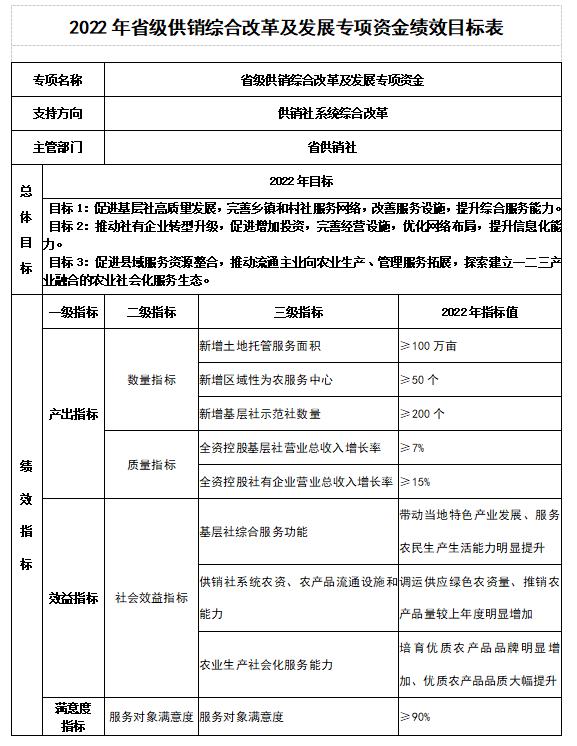 为支持全省供销社系统推进综合改革,按照《省级供销综合改革及发展专项资金管理办法》(川财建〔2020〕408号)规定,本次分配省级供销综合改革及发展专项资金5390万元。现就专项资金分配情况和全省绩效目标(详见附表)予以公开。