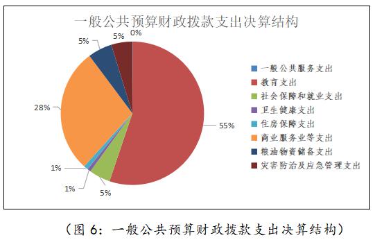 2019年一般公共预算财政拨款支出15891.13万元,主要用于以下方面:一般公共服务(类)支出17.81万元,占0.11%;教育支出(类)9184.11万元,占57.80%;社会保障和就业(类)支出801.08万元,占5.04%;卫生健康支出131.77万元,占0.83%;住房保障支出165.37万元,占1.04%商业服务业等支出4672.98万元,占29.41%;粮油物资储备支出910.00万元,占5.73%;灾害防治及应急管理支出8万元,占0.05%。