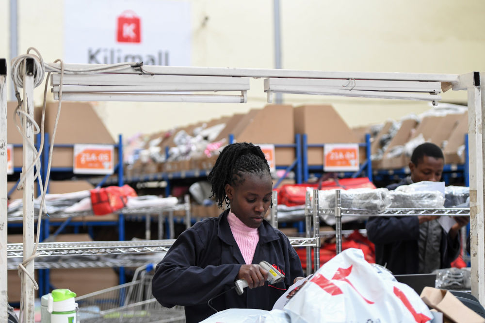 2023年7月28日,在肯尼亚姆洛隆戈,湖南长沙非拓信息技术有限公司旗下电商平台Kilimall的员工在仓库内分拣货物。新华社记者 李亚辉 摄