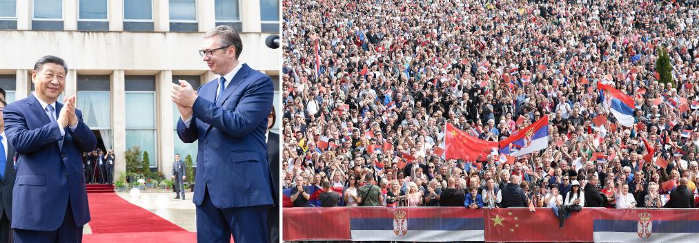 在塞尔维亚,武契奇总统率众多政要赴机场迎接习近平主席。近2万名塞尔维亚民众齐聚塞尔维亚大厦广场,挥舞中塞两国国旗,热情高呼“中国”的场景,令人感动;