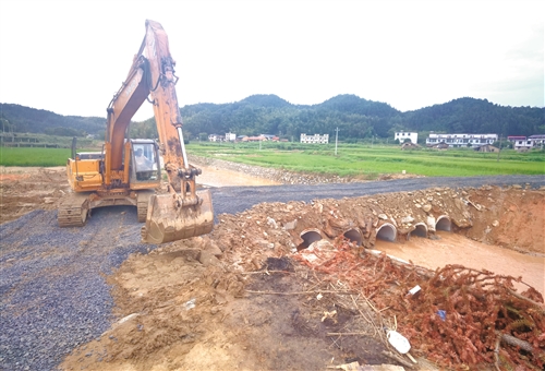 在资兴市难以调度挖机的情况下,工作队通过多方联系协调,从郴州市、桂阳县等地紧急调配4台挖机到村,联系指挥部协调采购20根直径1.5米涵管、落实近千立方碎石;市公路局专业技术人员连夜赶到现场指导,确定建桥方案,明确涵管架设、石料铺设等技术要求;现场安排一位有过工程建设经验的村民指挥协调,保障施工安全和质量。