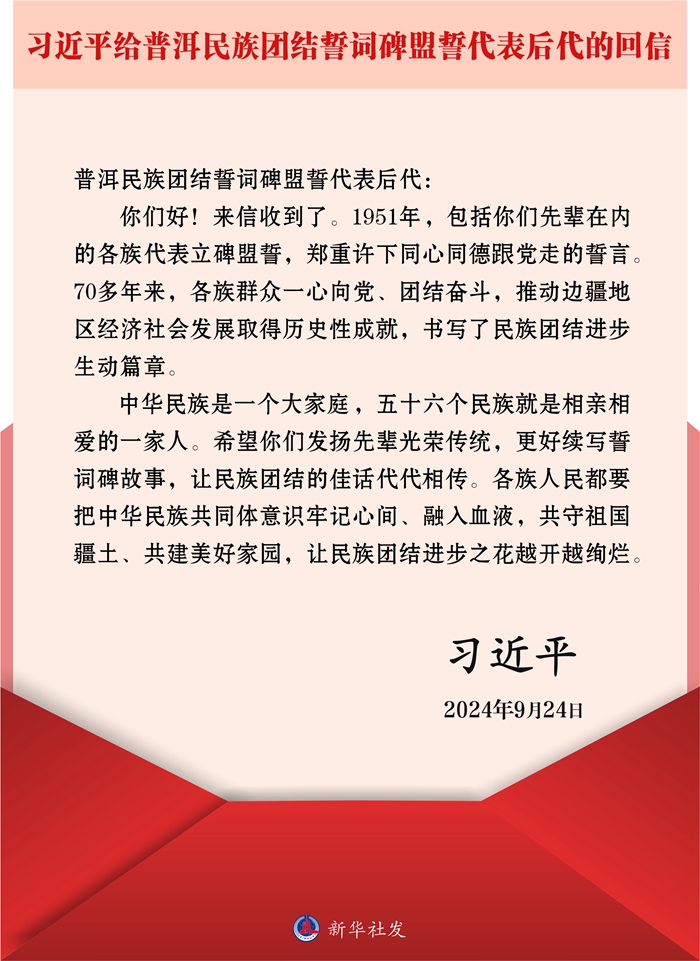 新华社北京9月25日电 近日,中共中央总书记、国家主席、中央军委主席习近平给普洱民族团结誓词碑盟誓代表后代回信,对他们予以亲切勉励并提出殷切希望。