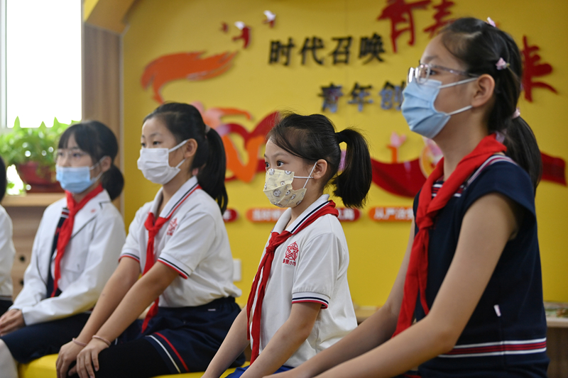 天津市和平区新星小学学生在观看电影《我和我的祖国》(2021年9月28日摄)。新华社记者 李然 摄