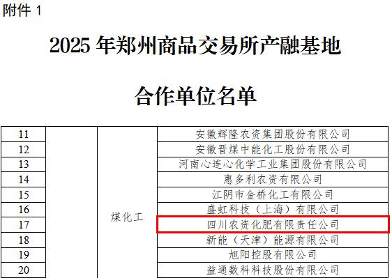 近日,郑州商品交易所正式公布2025年服务实体经济产融基地合作单位名单,四川省供销农资集团旗下川农化肥公司凭借在期货工具应用与产融结合领域的持续深耕及丰富经验、入围此次名单,标志着川农化肥公司连续五年蝉联郑商所服务实体经济产融基地合作单位。