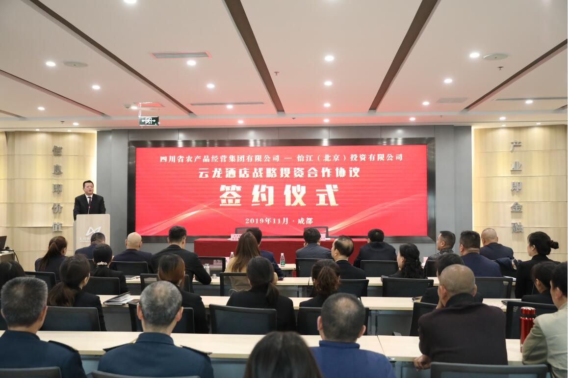 11月6日,四川省农产品经营集团与怡江(北京)投资有限公司就云龙酒店引入战略投资合作伙伴在成都市云龙大厦举行签约仪式。四川省供销社党组成员、副主任兼省供销投资集团董事长、总裁向伟益,四川省供销投资集团副总裁李志刚,怡江酒店集团CEO张华等出席签约仪式。签约仪式由四川省农产品经营集团董事长韦兴林主持。