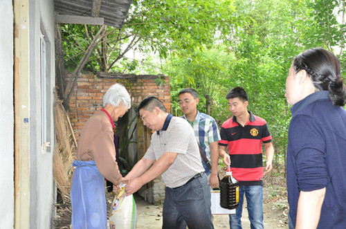 随后慰问组来到18名“一对一”困难党员、困难群众的家中,与党员群众进行了亲切交流,切实了解他们的生活状况及面临的实际困难,宣传了再生资源回收新模式,鼓励党员群众在村委会领导下,树立起战胜困难的信心,构建共创共享的社会管理新机制。针对困难党员群众急需解决的生活问题,按每人200元的标准,为联系村18名困难党员群众赠送大米、菜油和牛奶等价值3600元生活必需品,将党组织的关怀和温暖带给他们。