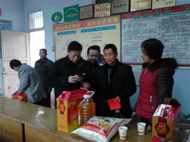 2014年1月26日,大英县供销社党组成员、副主任吴会权(左三)、党组成员、纪检组长贺昌兵(左四)到联系的大英县智水乡斩龙垭村对7户平困户进行春节慰问。为他们送去了大米、面、油、腊肉、香肠、汤圆粉等价值200元的物品,并每人发慰问金200元。共计2800元。受到了当地党委、政府、村领导和群众的好评。
