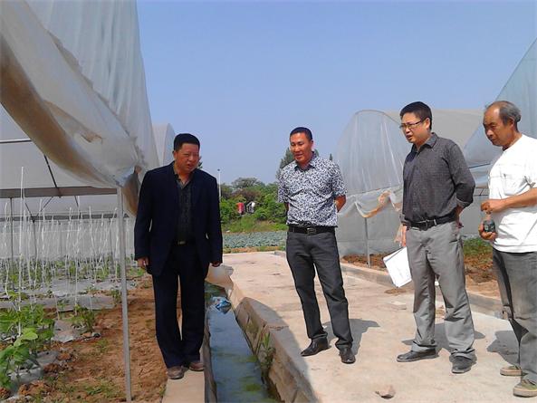 4月30日,大英县供销社党组成员、副主任吴会权(左一)、财会审计股股长叶立新(右二)在项目负责人彭建平(左二)的陪同下,深入到大英县雪秀蔬菜专业合作社检查督导2013年四川省遂宁市大英县300亩大棚蔬菜种植改建项目建设情况。