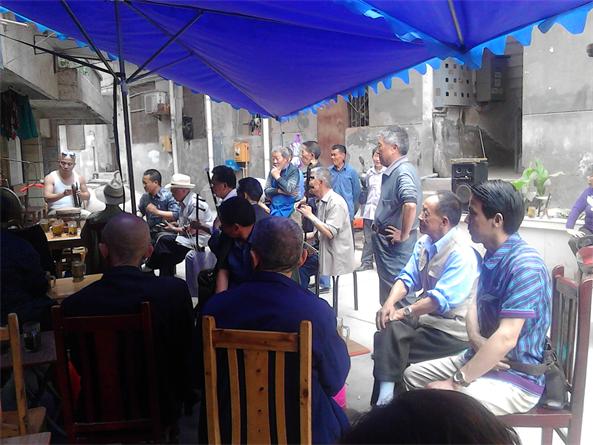 县供销社机关支部书记何俊阳(左一)作为县供销社专门负责联系社区负责人,经常亲临座唱会现场指导。