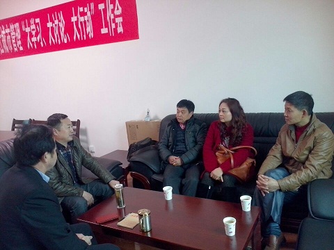 近日,大英县供销社党组书记、主任李兴建(左二)与四川天地源投资有限公司法人代表王开强(中)座谈。