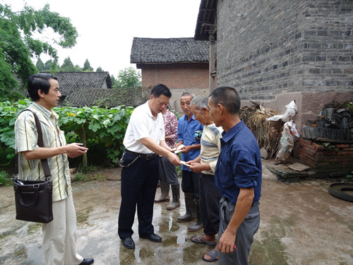 6月30日上午,大英县供销社副主任吴会权(左二)带着供销人对农民群众浓浓深情,冒着沥沥细雨,率领机关支部书记何俊阳(左一)深入到天保镇狮子寨开展“七一”慰问活动。为5位贫困老党员每位送去了慰问金200.00元。