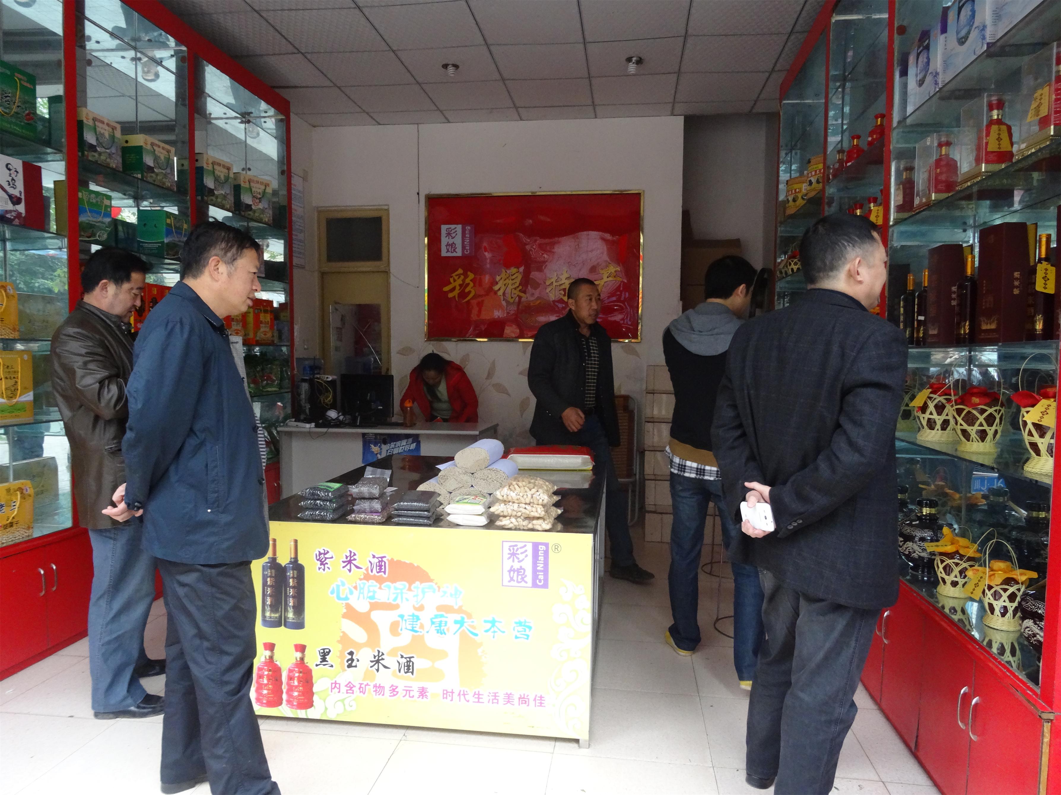 大英县供销社党组书记、主任李兴建(右一)、副主任吴会权(左二)在调研彩原粮油种植专业合作社直销店。