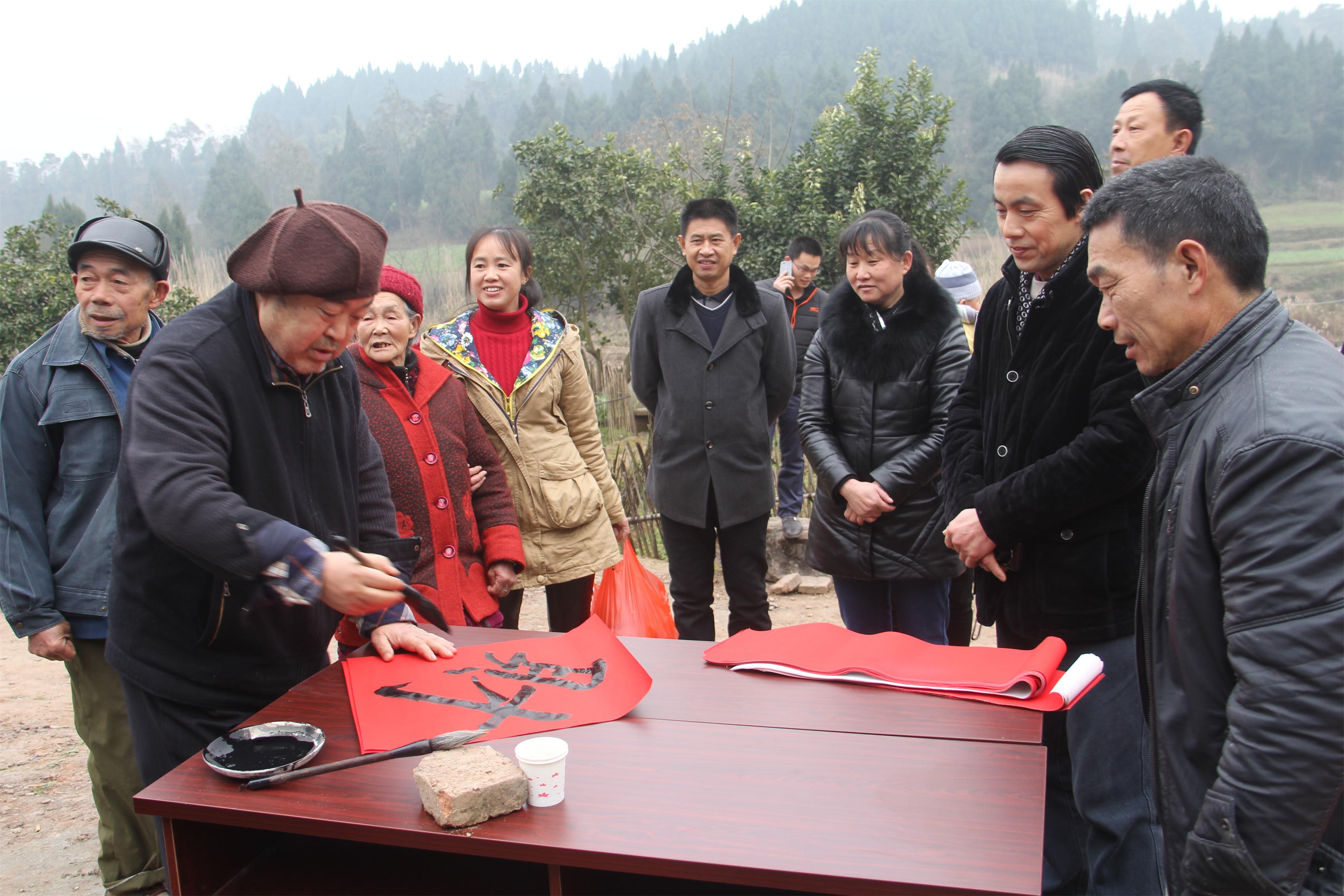 2月5日,大英县供销社机关支部书记、狮子寨第一书记何俊阳(右二)邀请县书法家一行5人到联系的扶贫村天保镇狮子寨为村民写春联,受到了当地村民热情欢迎。当天共为村民写春联120副。